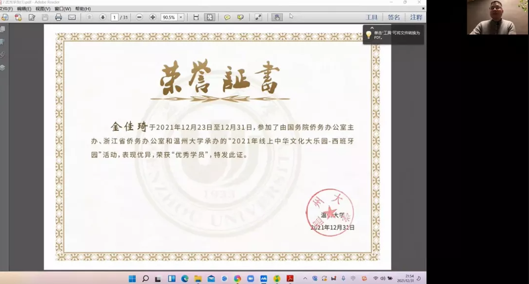 北京时间12月31日晚,“2021年线上中华文化大乐园—西班牙园”闭园仪式通过线上会议形式举行。云顶7610线路检测教学科科长林允朋主持仪式。