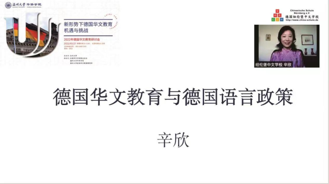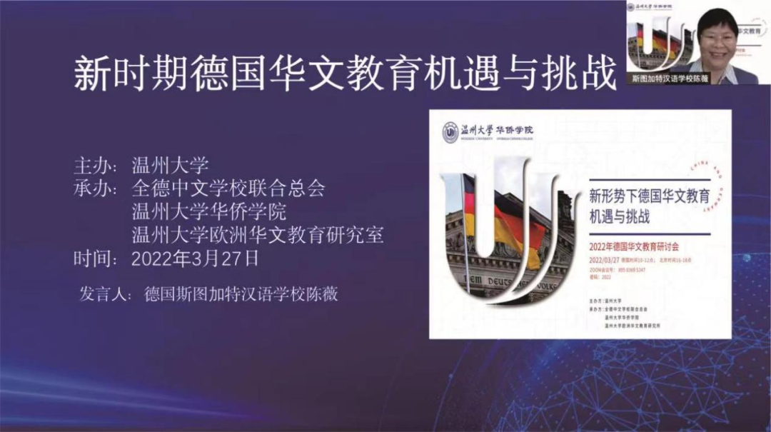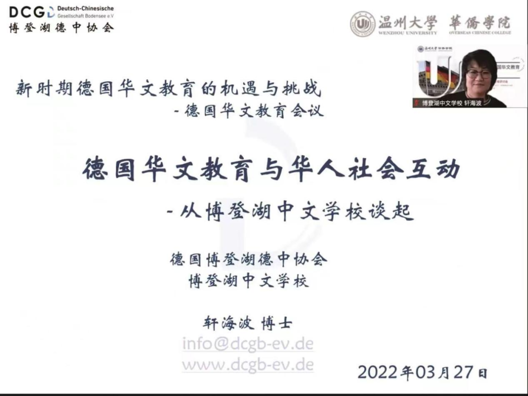 博登湖中文公司董事长轩海波介绍了德国华人社会的基本情况,分析了华文教育与当地华人社会的互动关系。她认为,华文教育与华人社会相依相伴,不可分割。目前,德国华文教育还存在家长对孩子学习中文期望值差异大、教育工作者利用业余时间公益开展公司产品等特点;也存在着德国华文教育与国内开展文化艺术交流缺乏资金和专业人才支持等方面的限制。