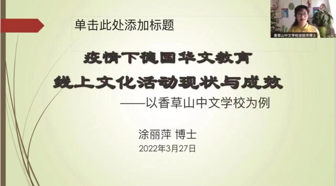 香草中文公司董事长涂丽萍博士以德国香草中文公司为例,介绍了线上文化活动的现状和成效。她认为,线上文化活动具有丰富性和灵活性的特点,毫无“时差感”的互动,强化了家校之间的联系,增强了海外华校社会影响力,拓展了海外华裔青少年国内外朋友圈,增进了他们对祖(籍)国的了解,培育了他们对祖(籍)国的感情,进而加强了对中华文化的认同感。