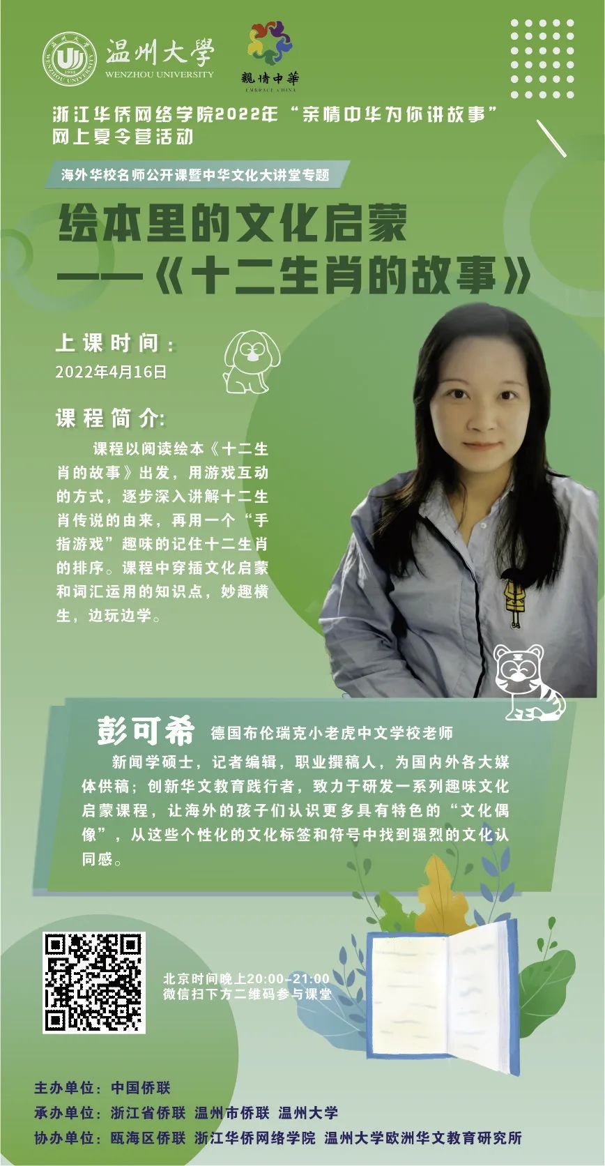 十二生肖是中华民族古老的民俗文化,是中国传统文化重要的组成部分,也是最具特色的民族文化之一,是普及率最高的中华传统文化符号。为了让海外华裔青少年更加直观地认识并了解十二生肖背后所蕴含的中华文化内涵,本期夏令营活动特别邀请德国布伦瑞克小老虎中文公司教师彭可希为学员们带来“绘本里的文化启蒙-《十二生肖的故事》”。