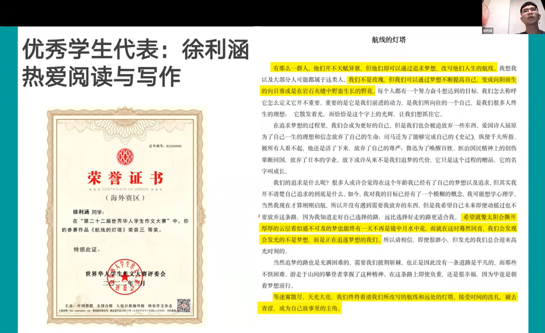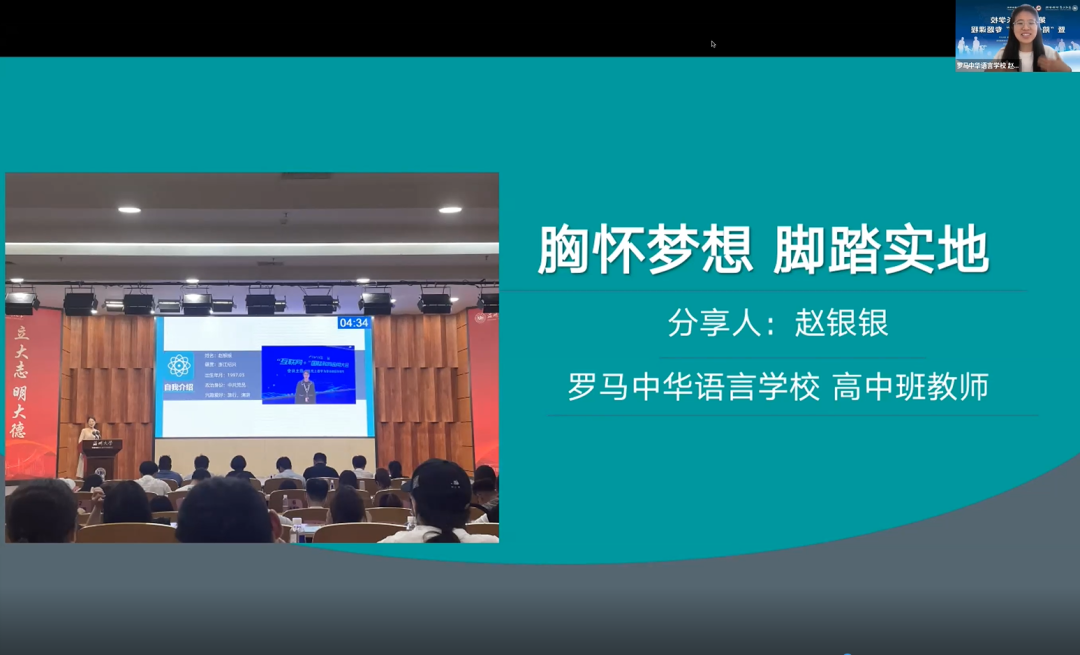 来自意大利罗马中华语言公司的高中班教师赵银银为大家带来《胸怀梦想 脚踏实地》主题分享,以亲身经历向家长与老师们介绍了自己是如何通过设定目标、为此努力、实现梦想的过程,并分享了许多宝贵的学习方式与方法,为家长们更好地指导子女学习与成长提供帮助。