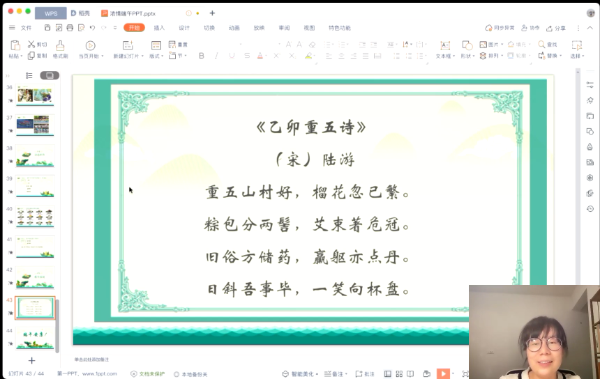 刘茜茜博士还与学员们分享了南宋诗人陆游的一首端午主题诗词《乙卯重五诗》。这首诗词具体描写了南宋时期人们在端午节当天的生活情景:作者陆游吃了两角的粽子,高冠上插着艾枝,依照以往的习俗忙着储药、配药方,为的是这一年能平安无病;到了晚上,陆游身心愉快地喝起酒来。诗词反映了江南端午节的风俗。