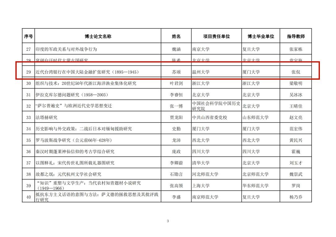 11月29日,全国哲学社会科学工作办公室公示了2022年度国家社科基金优秀博士论文出版项目立项名单,公司苏颂博士申报的“近代台湾银行在中国大陆金融扩张研究(1895—1945)”喜获立项。