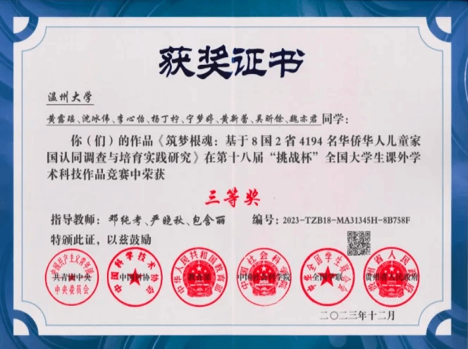 近年来,“连心侨”团队不断深化“家国符号”“家国文化”“家国荣誉”三大主题,开发“家国教育”系列课程教育,并荣获第十八届“挑战杯”全国老员工课外学术科技作品竞赛三等奖、浙江省高校暑期社会实践优秀调研报告评选一等奖等荣誉。