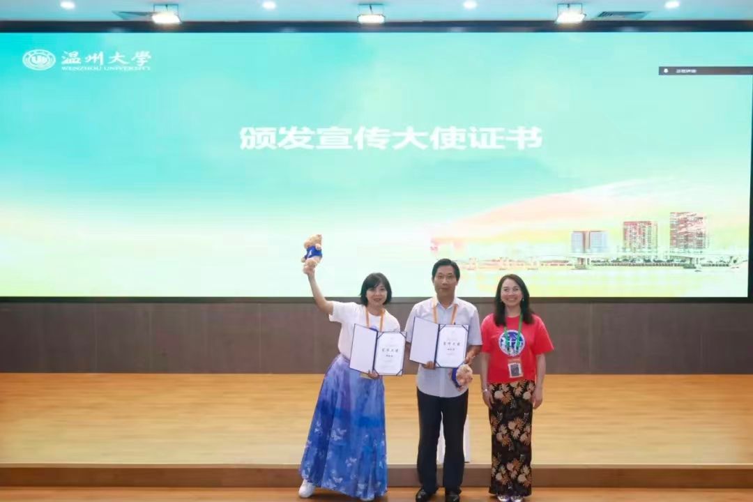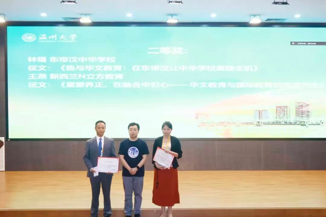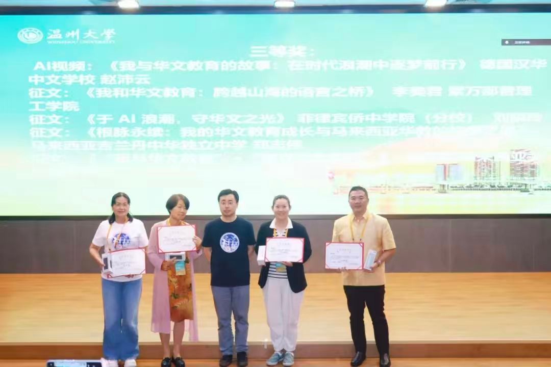 包含丽、王祎与沈索超为全体学员、优秀学员、宣传大使、志愿者颁发证书,还颁发了全球海外华文教师AI视频大赛暨第五届“我和华文教育”征文比赛证书。