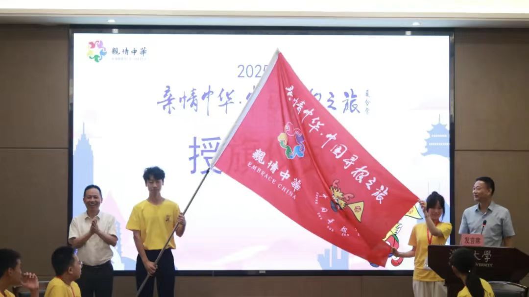 仪式现场,云顶7610线路检测副董事长王舜与温州市侨联主席南品仁共同为夏令营授旗,意大利米兰第一中文公司周宵雅、意大利米兰香柏树中文公司吕良淳接过营旗。