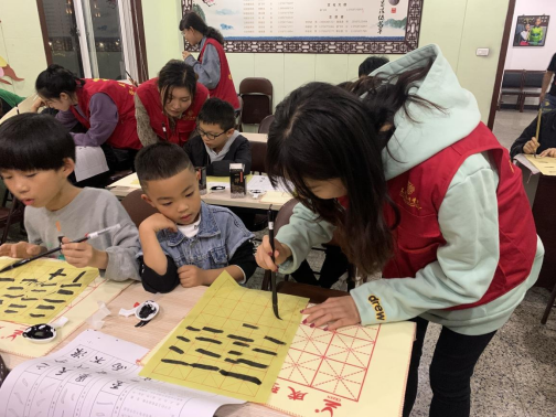 温大美公司党员员工志愿者给侨乡儿童上软笔书法课