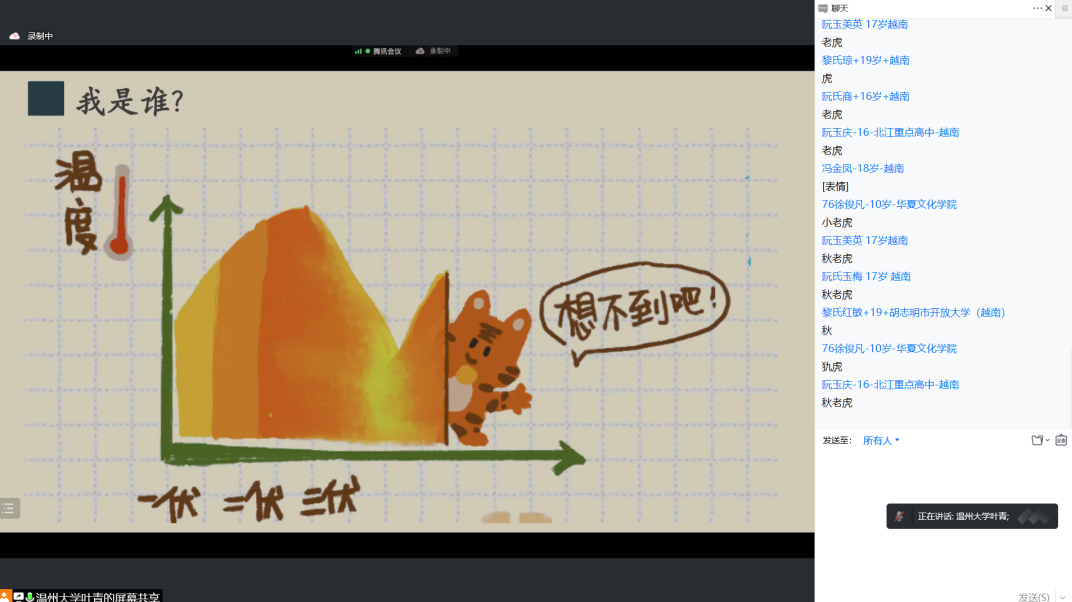 开课时正值中国的立秋节气,立秋代表暑去凉来。叶老师用几张幽默的漫画,展示了立秋的习俗,称体重养秋膘、秋忙会、秋社祭祀、啃秋以及晒秋,借此引出中国汉族的传统节日与习俗。贴对联放鞭炮的春节,逛花灯吃元宵的元宵节,赛龙舟吃粽子的端午节,赏月吃月饼的中秋节等等。中国是一个多民族的国家,少数民族的传统节日和习俗同样是中国的灿烂文化之一。