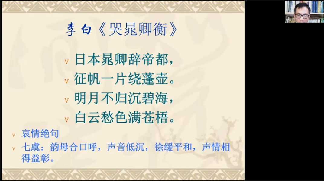 古诗词是我国传统文化的重要内容之一。学习古诗词对陶冶情操、提升审美都具有积极作用。在古诗词鉴赏课程中,陈胜武老师着重为大家讲解了古诗词的音乐美。他从每位同学的姓名入手,引出汉语诗词韵律中的抑扬顿挫,并通过古今汉语的发音、汉语与外语发音的纵横对比,让学员们切身体会到了古诗词中包含的美学元素及蕴含的优美意境。