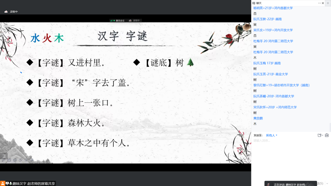 在趣味汉字课程中,赵银银老师采用“同族字”教学的方法,以“心”和“金木水火土”五行相关汉字为纲,既重视员工已有的语言、文化基础,又进行适当的拓展与延伸,向学员们讲解了汉字的意义与用法。在讲解“忘、忙、思、想、情、息”等“心”族字时,赵老师引入了成语、古诗词、中国传统节日、文化典籍等多种元素。赵老师通过《战国策》中“亡羊补牢”的成语引出了与“心”有关的汉字“忘”,帮助学员们清晰地理解“忘”字的涵义;通过“红豆生南国,春来发几枝。愿君多采撷,此物最相思”的美好意境,帮助大家感受意味深长的“情”与“思”;通过“云想衣裳花想容,春风拂槛露华浓”,帮助学员在春风满纸、花光满眼中明白汉字“想”。