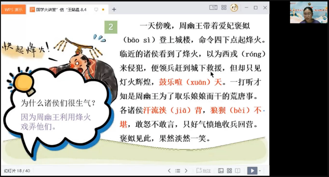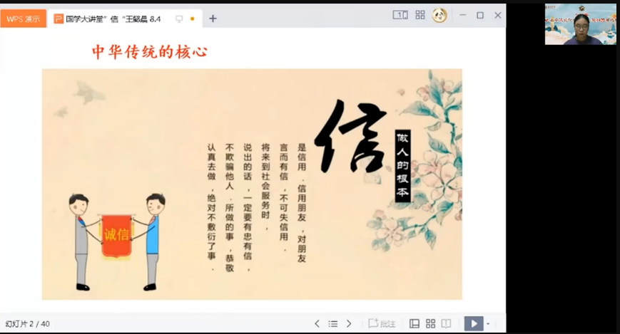 国学大讲堂课程中,王懿晨老师围绕传统道德与中华人文精神中的“信”来展开。王老师通过“狼来了”“烽火戏诸侯”等引入“信”这一理念,并以小故事的形式告诉同学“信”对个人、对国家的重要性。王老师还将中国朝代年表、西周分封制等历史知识与“鼓乐喧天”“汗流浃背”“狼狈不堪”“故伎重演”等成语穿插起来,进一步丰富了学员们对中国语言文化的感知。