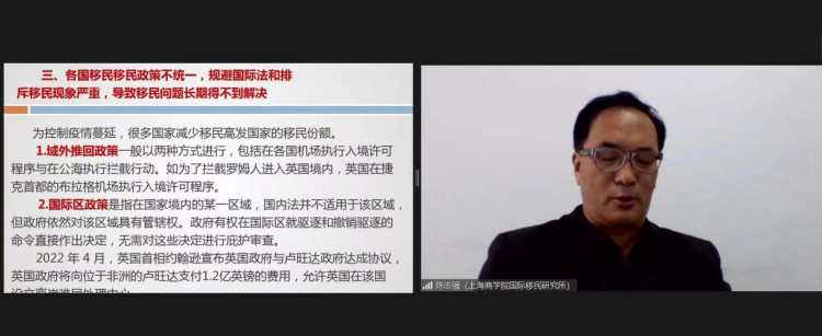 上海商公司国际移民研究所所长陈志强教授做了题为《国际移民新趋势与中国的政策应对》的主题发言。他指出,疫情导致的经济衰退和人员往来的减少,客观上刺激了部分地区的贫困加剧和非法移民、难民数量激增,移民失踪、死亡事件迅速增加,引起国际社会对此现象的关注。此外,各国移民移民政策不统一,规避国际法和排斥移民现象严重,导致移民问题长期得不到解决。