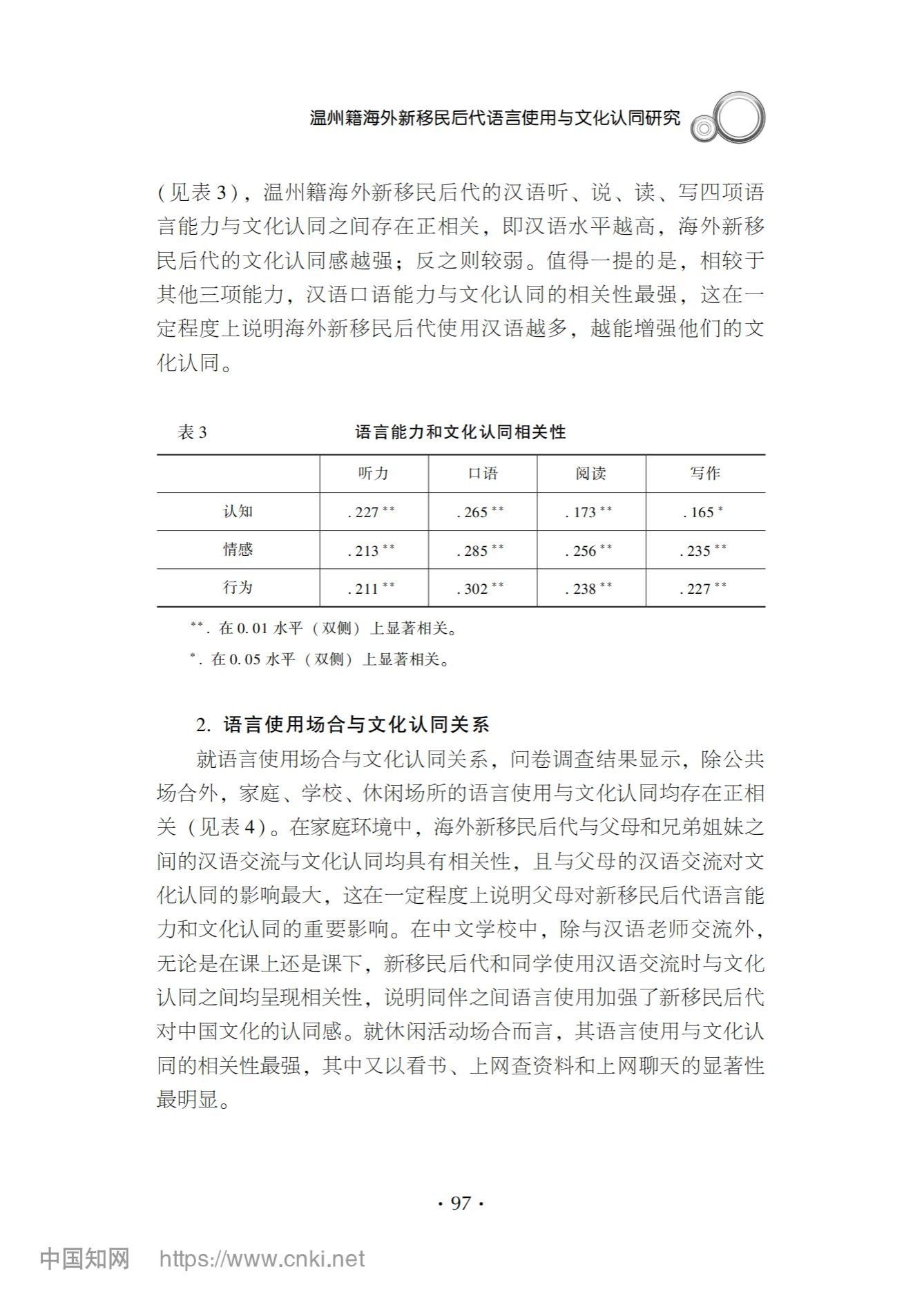 本文考察了温州籍新移民后代语言使用与文化认同现状、语言使用与文化认同的相关性及其影响因素。研究结果显示,温州籍海外新移民后代呈现多语使用样态,其中以汉语和居住国语言为主,方言和英语使用较少。他们对中国整体文化认同感较强,且高于对祖籍地温州的文化认同。就语言使用与文化认同的关系来看,在家庭、公司、休闲活动场合,汉语使用与文化认同均呈现正相关,且休闲活动场合的相关性最强。此外,访谈数据分析显示,海外新移民后代语言使用主要影响因素是家庭环境和中文公司教育,还受族群归属、语言态度和社交网络的影响。本文对提高温州籍海外新移民后代的语言使用与文化认同具有一定的启示与借鉴。