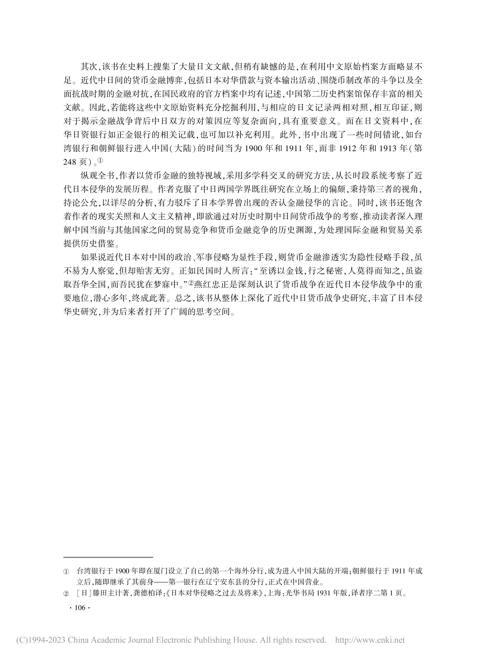 中日关系是近代中日两国最重要的对外关系之一。自1894年甲午战争以来,日本对中国展开了长达半个世纪之久的侵略,企图一步步吞并中国并纳入殖民统治之下。在日本对华侵略进程中,货币金融手段成为与政治、军事并存的侵略路径,并且相较而言,金融渗透更具先行性、隐蔽性。货币战争乃近代中日战争的重要面向。