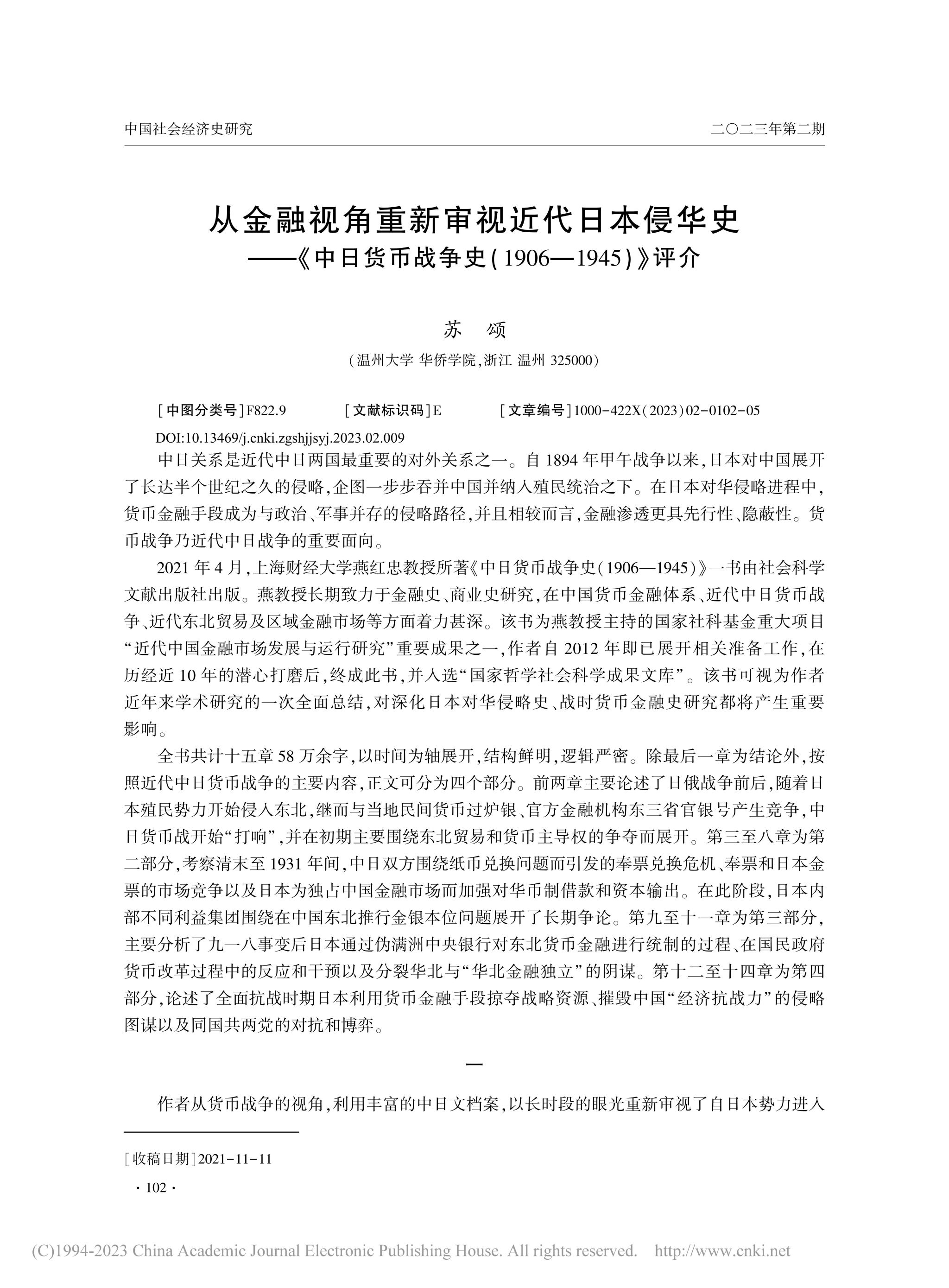 本期侨研究成果分享:苏颂《从金融视角重新审视近代日本侵华史——<中日货币战争史(1906—1945)>评介》。
