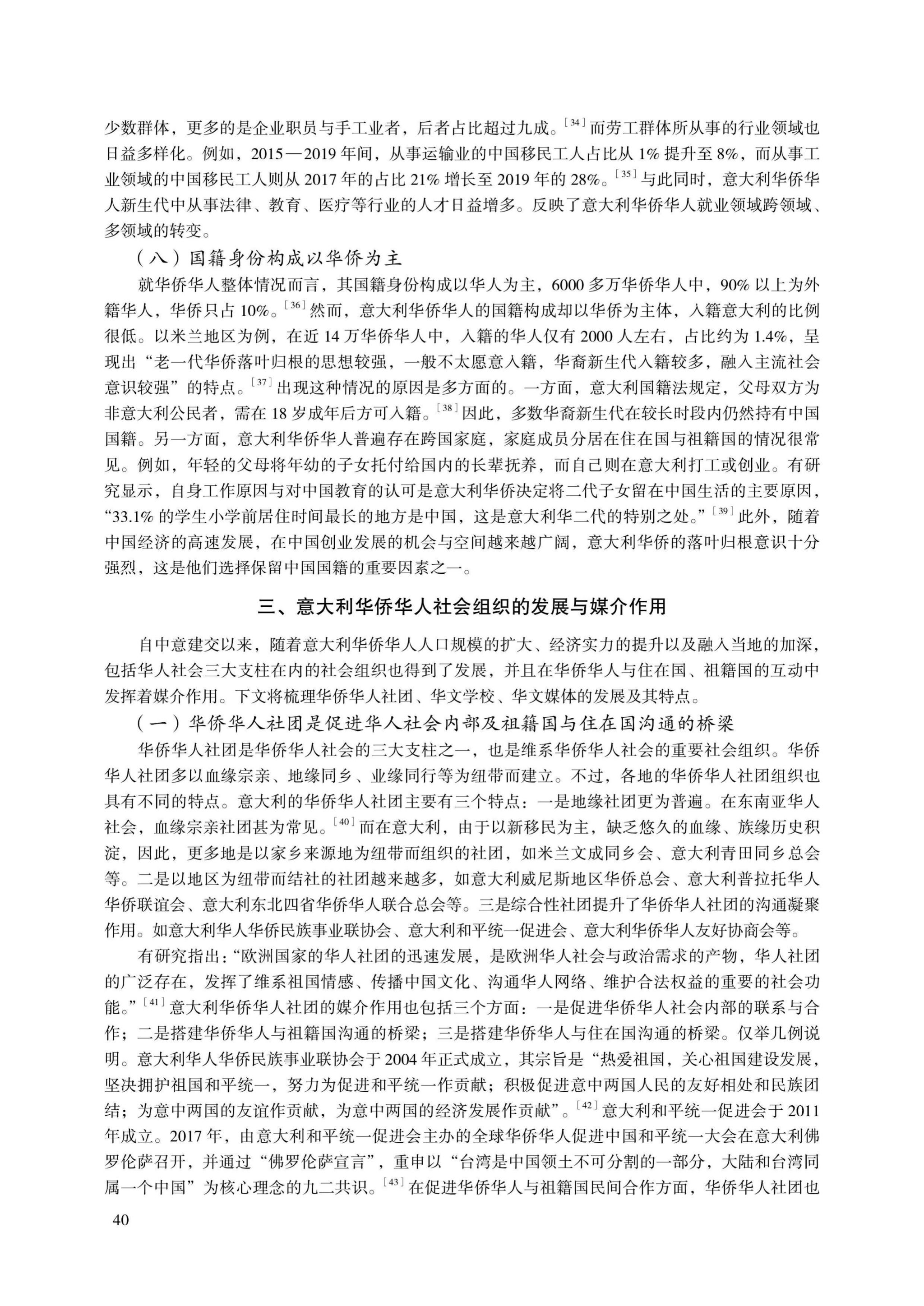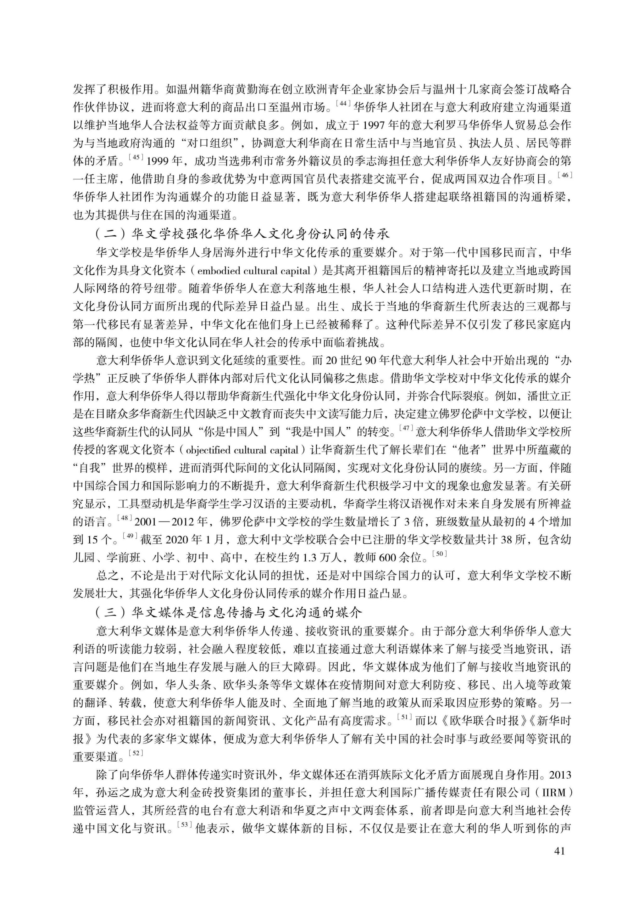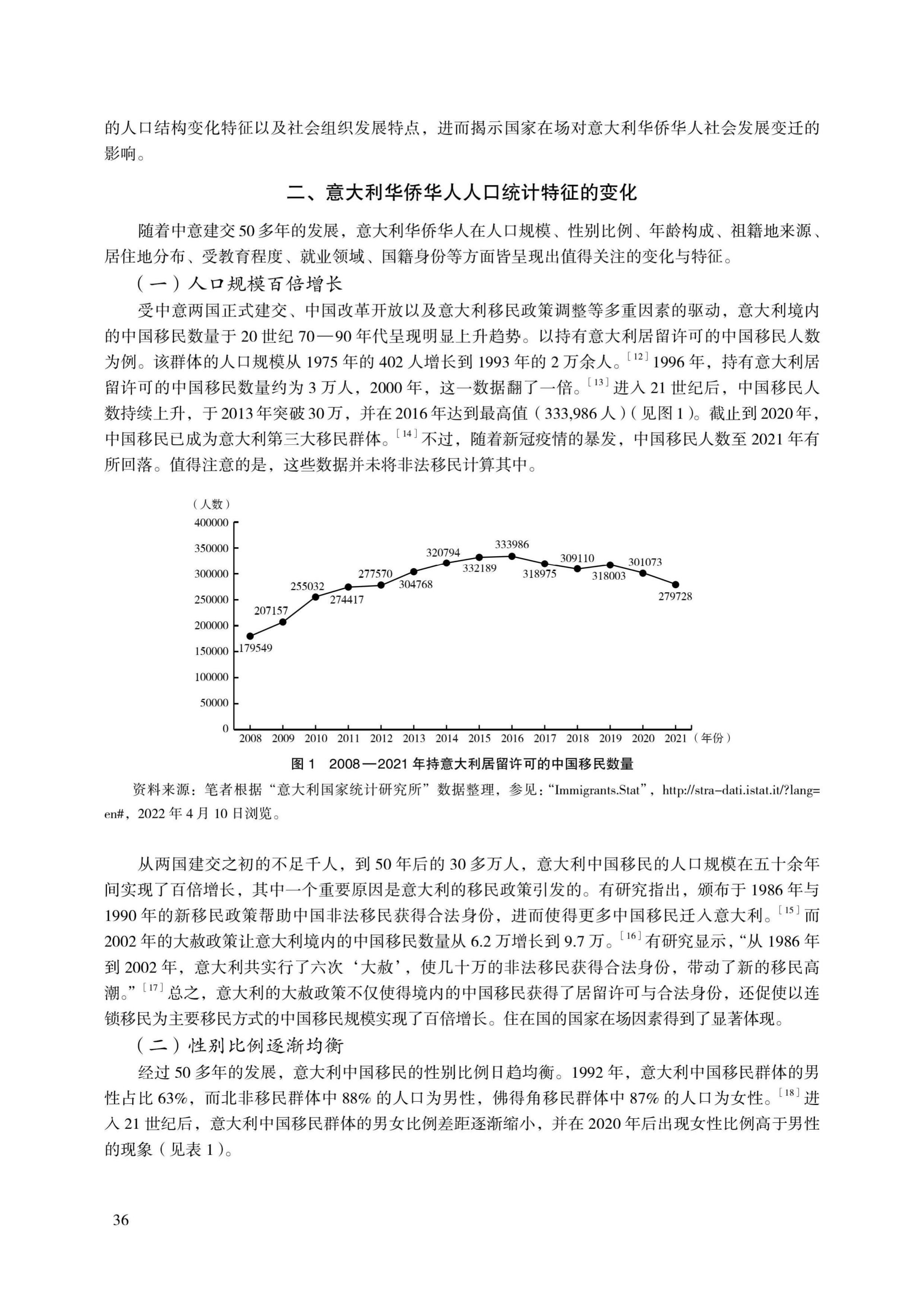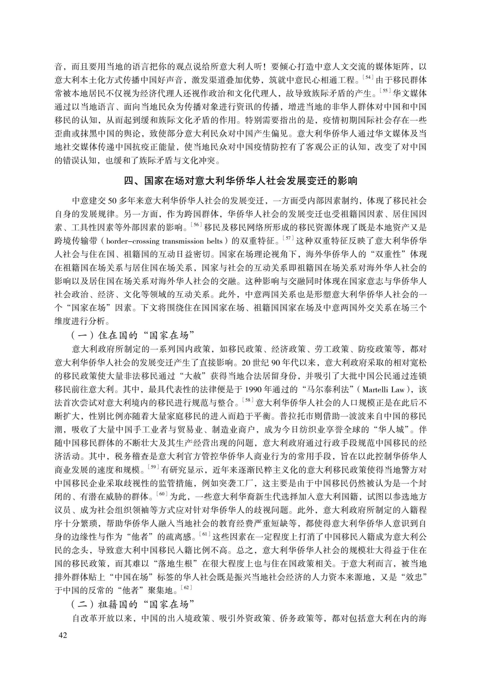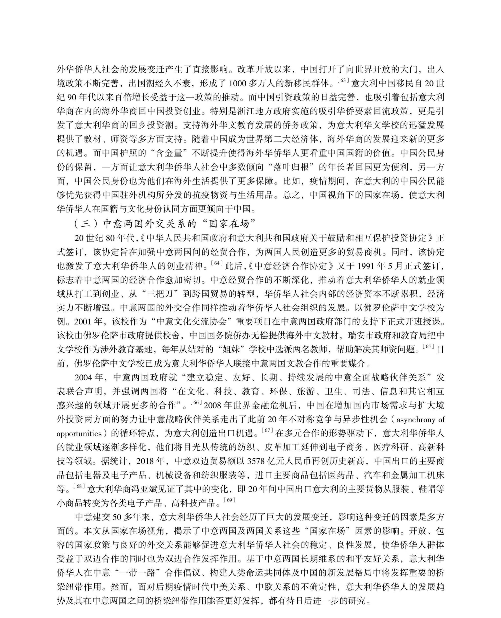 《中意建交以来意大利华侨华人社会的变迁——以国家在场理论为中心的分析》论文从“国家在场”理论视角,探讨了意大利华侨华人人口统计特征的变化、意大利华侨华人社会组织的发展与媒介作用,以及“国家在场”对意大利华侨华人社会发展变迁的影响。自1970年以来,意大利华侨华人社会在人口结构、社会组织两方面展现出日益显著的变化特征与发展特点。意大利“国家在场”、中国“国家在场”及中意两国外交关系,皆对意大利华人社会的发展变迁产生深刻影响。开放、包容的国家政策与良好的外交关系能够促进意大利华侨华人社会的稳定、良性发展,使华侨华人群体受益于双边合作的同时也为双边合作发挥作用。基于中意两国长期维系的和平友好关系,意大利华侨华人在中意“一带一路”合作倡议、构建人类命运共同体及中国的新发展格局中将发挥重要的桥梁纽带作用。